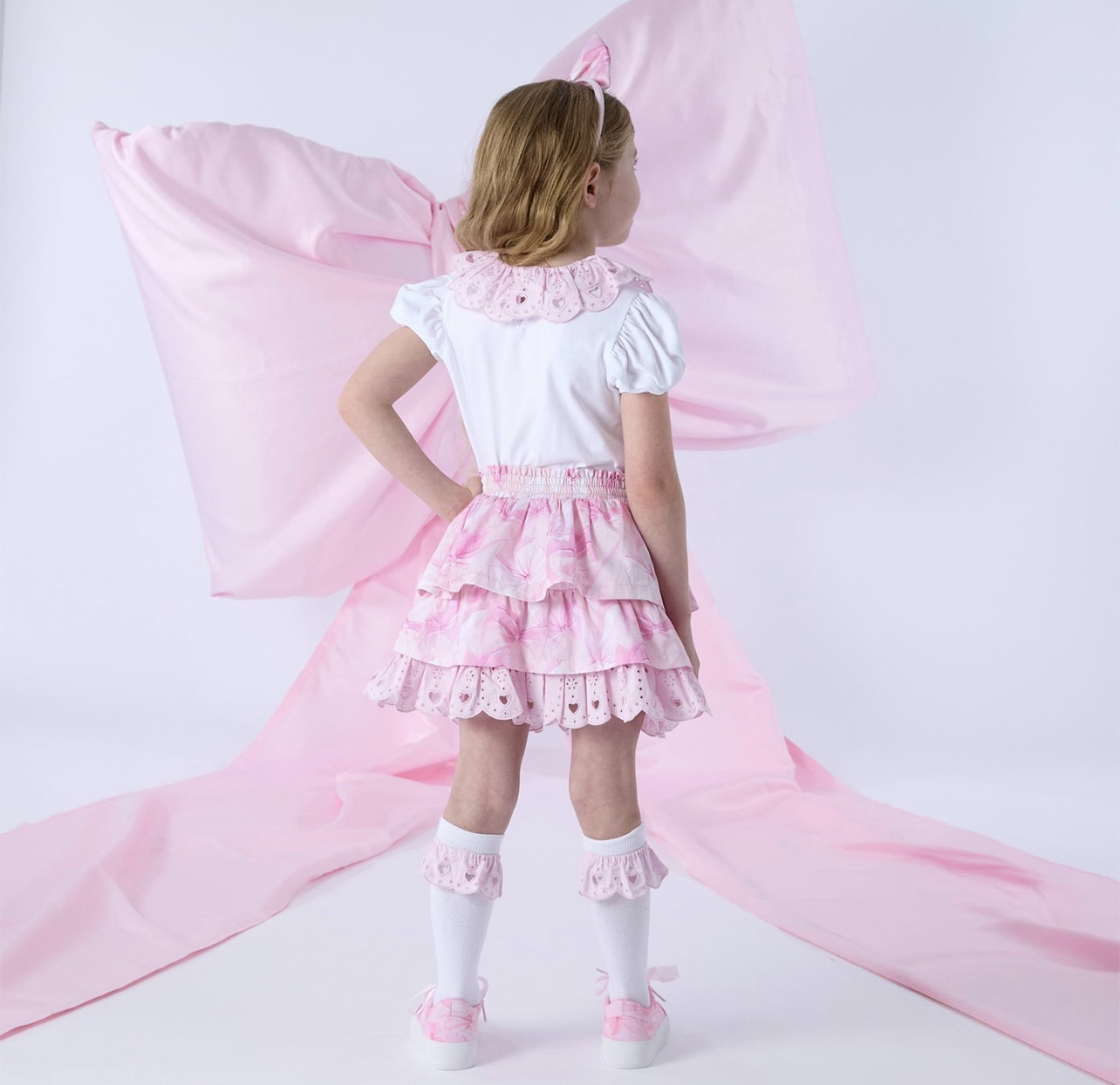 The short-sleeve top features a delicate pink ruffled collar with heart embroidery and an adorable bow print accented with pearl-style details for a polished, girly finish. Paired with a matching layered skirt, the set showcases a soft bow pattern, elasticated waistband for easy wear, and a scalloped hem with heart eyelet detailing for extra flair.