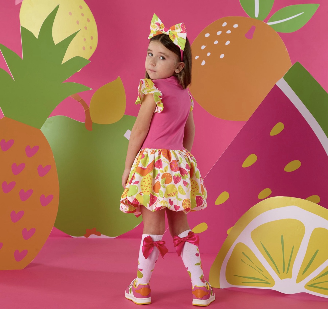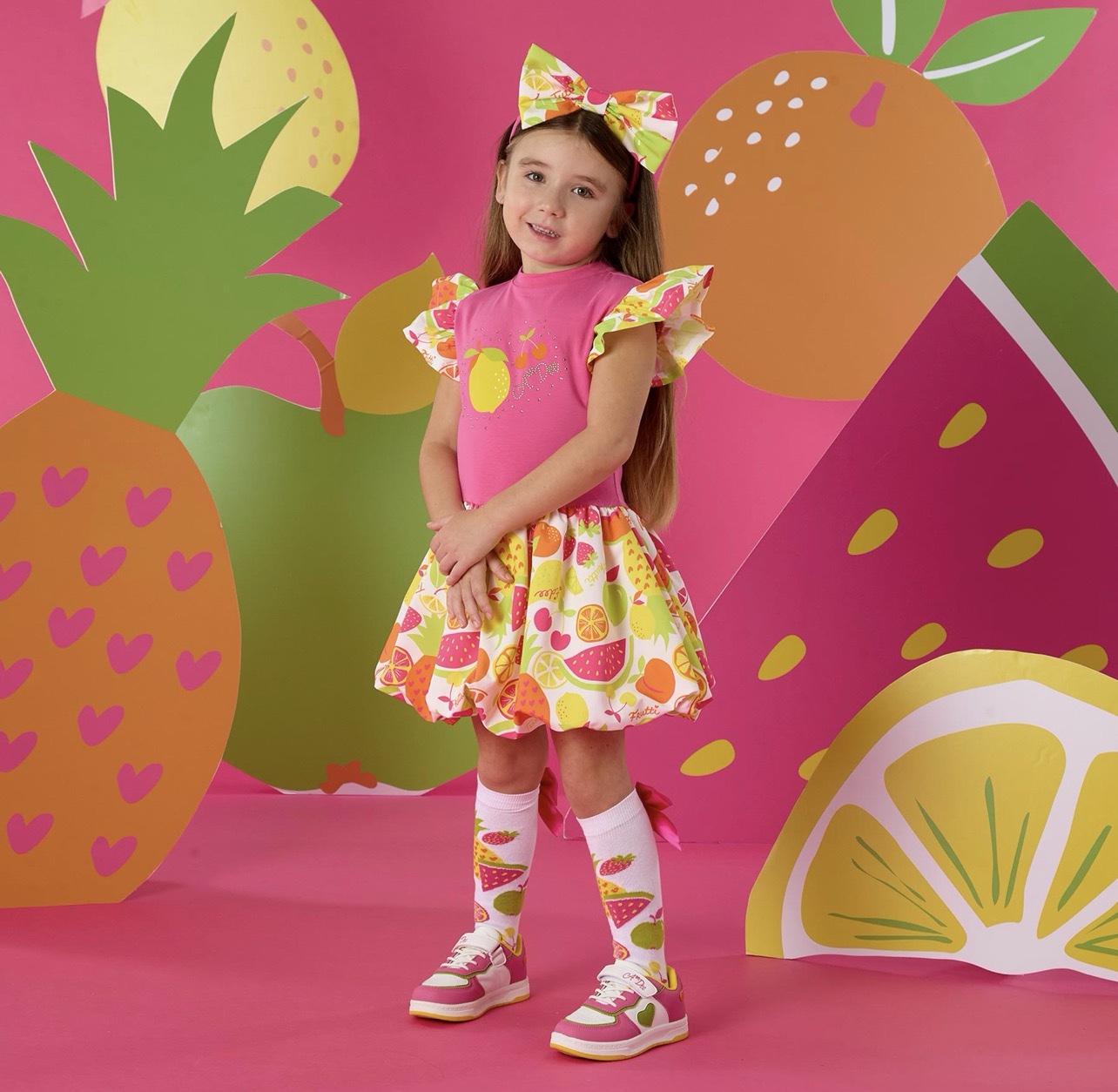 A Dee Tutti Frutti Dress is a must-have for your little girl’s summer wardrobe. Designed with a vibrant pink bodice and a colourful fruit-print skirt, this adorable dress captures the fun spirit of summer.