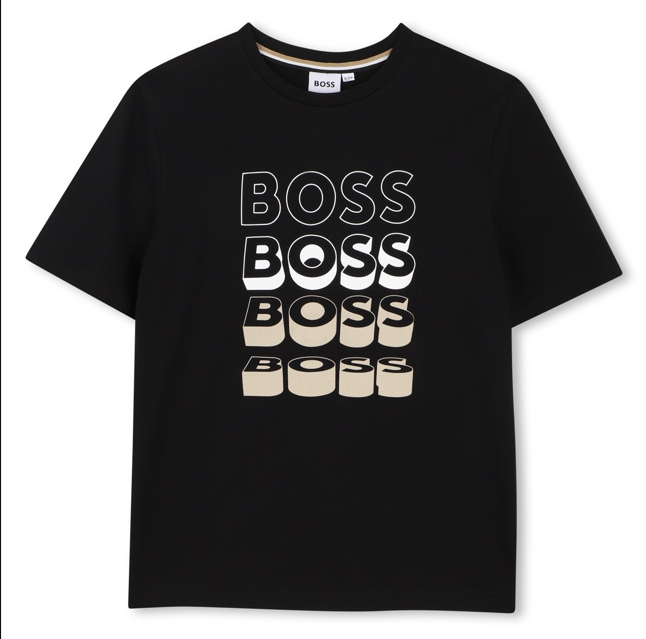 This set features a t-shirt with a bold 3D logo across the front, paired with black and camel swim shorts.