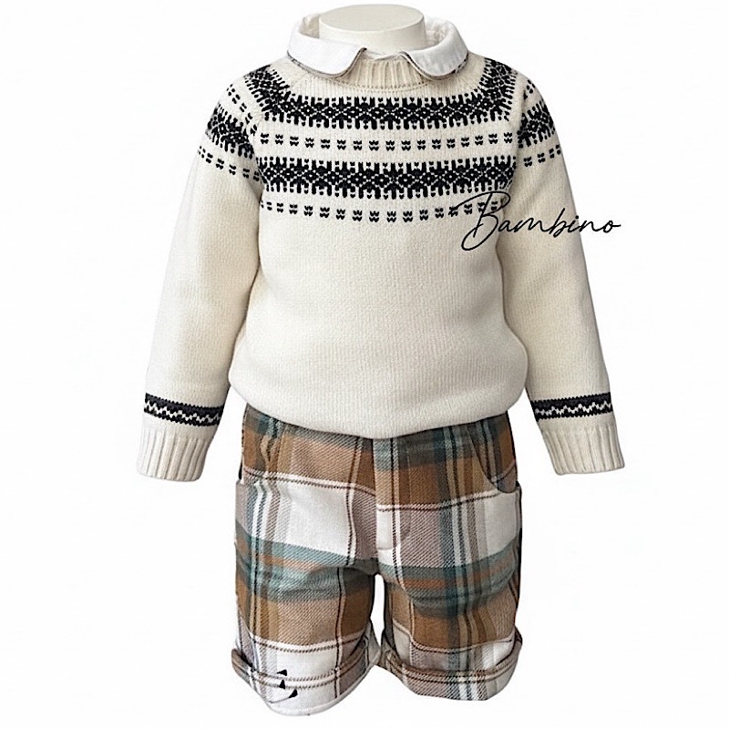 Boys traditional style short set by Cesar Blanco. Set includes cream and emerald green tartan shorts made in a winter warm fabric, long sleeve piped shirt a fairisle jumper and knee high socks.