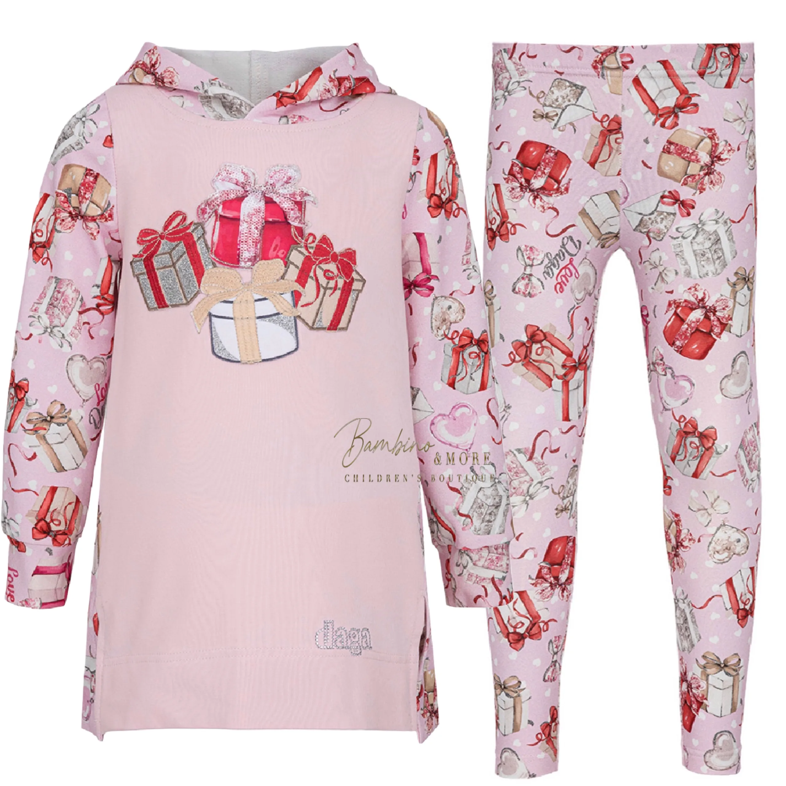 Girls pink present patterned hoodie with matching leggings from the magical surprises collection.