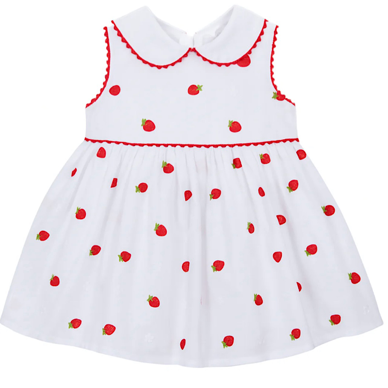 A girls white dress sleeveless summer dress adorned with sweet red strawberries by Deolinda.
