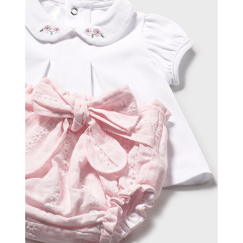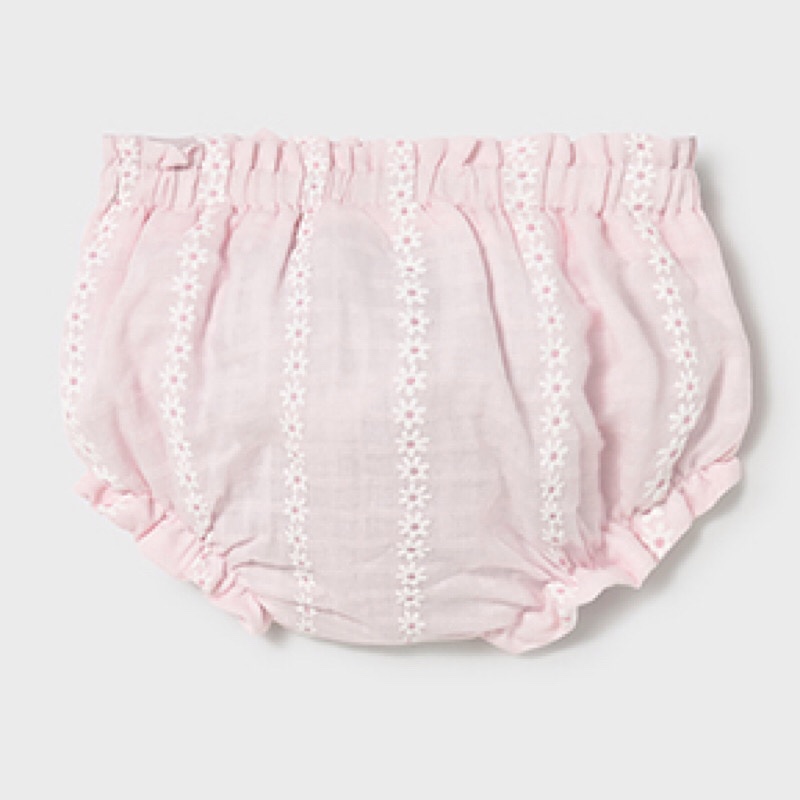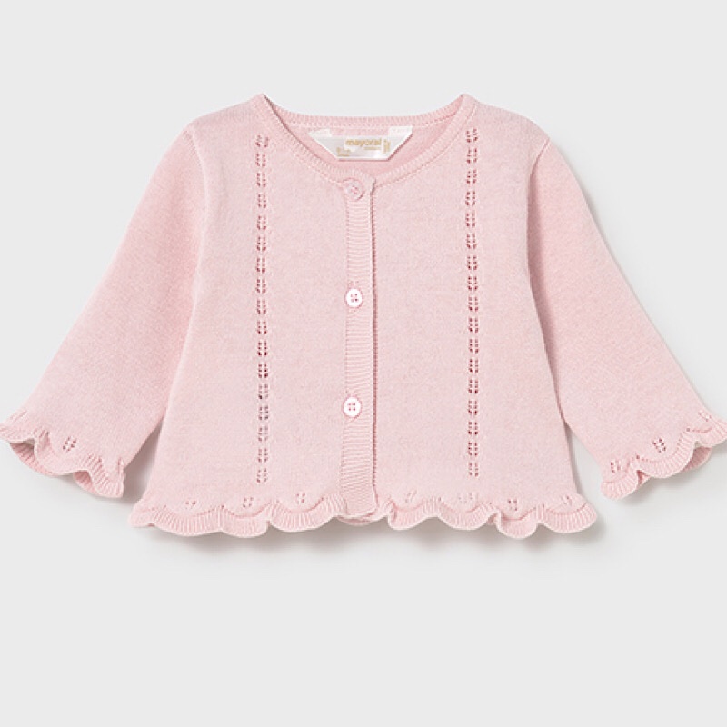 Baby girls pink soft knit cardigan featuring a delicate scalloped, fastening at the front with buttons. Paired with a white short-sleeve jersey cotton top adorned with an embroidered flower on each side, and completed with matching jam pants for a coordinated and charming ensemble.