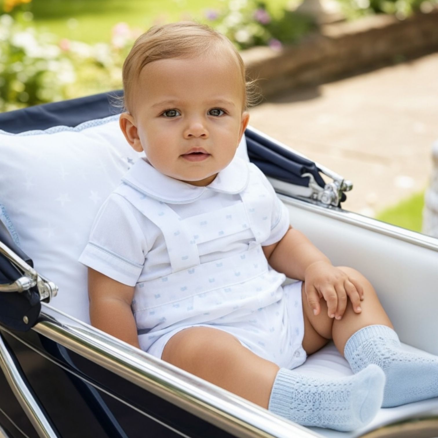 The set includes a white short sleeve shirt with a blue piped edge, paired with traditional style H bar shorts.