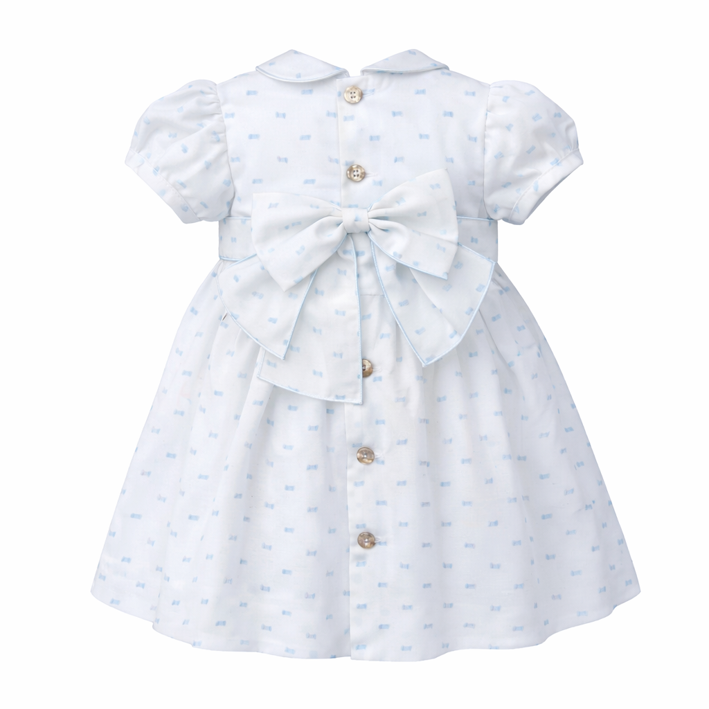 Naxos girls blue and white polka dot smocked dress with a bow at the back.