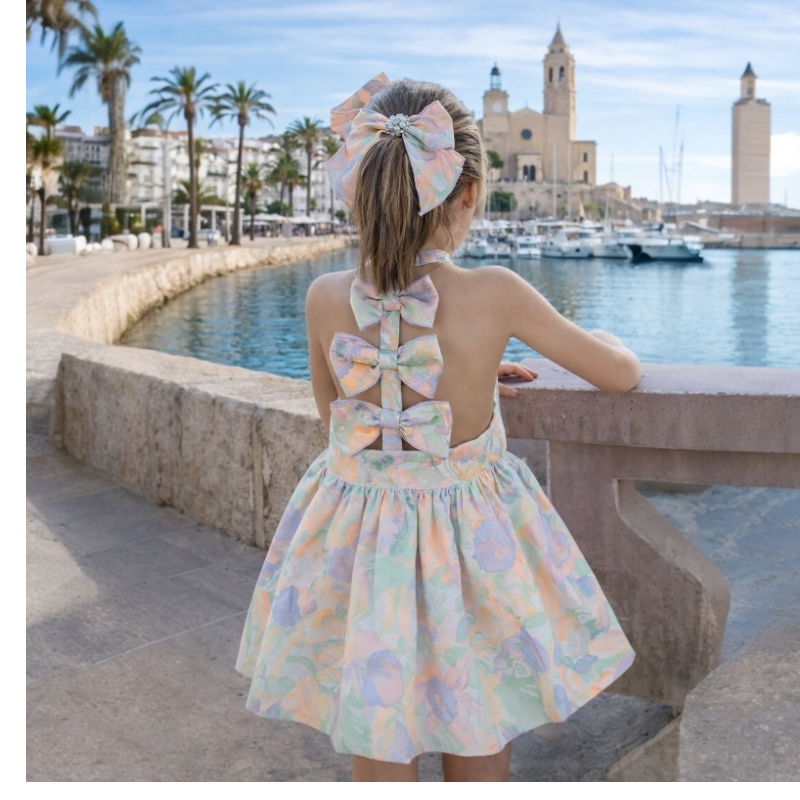 Made from a pastel floral fabric, this dress features a classic halter neckline, a full gathered skirt, and delicate bow detailing at the waist. The back has vertical bow accents for a refined, boutique finish.