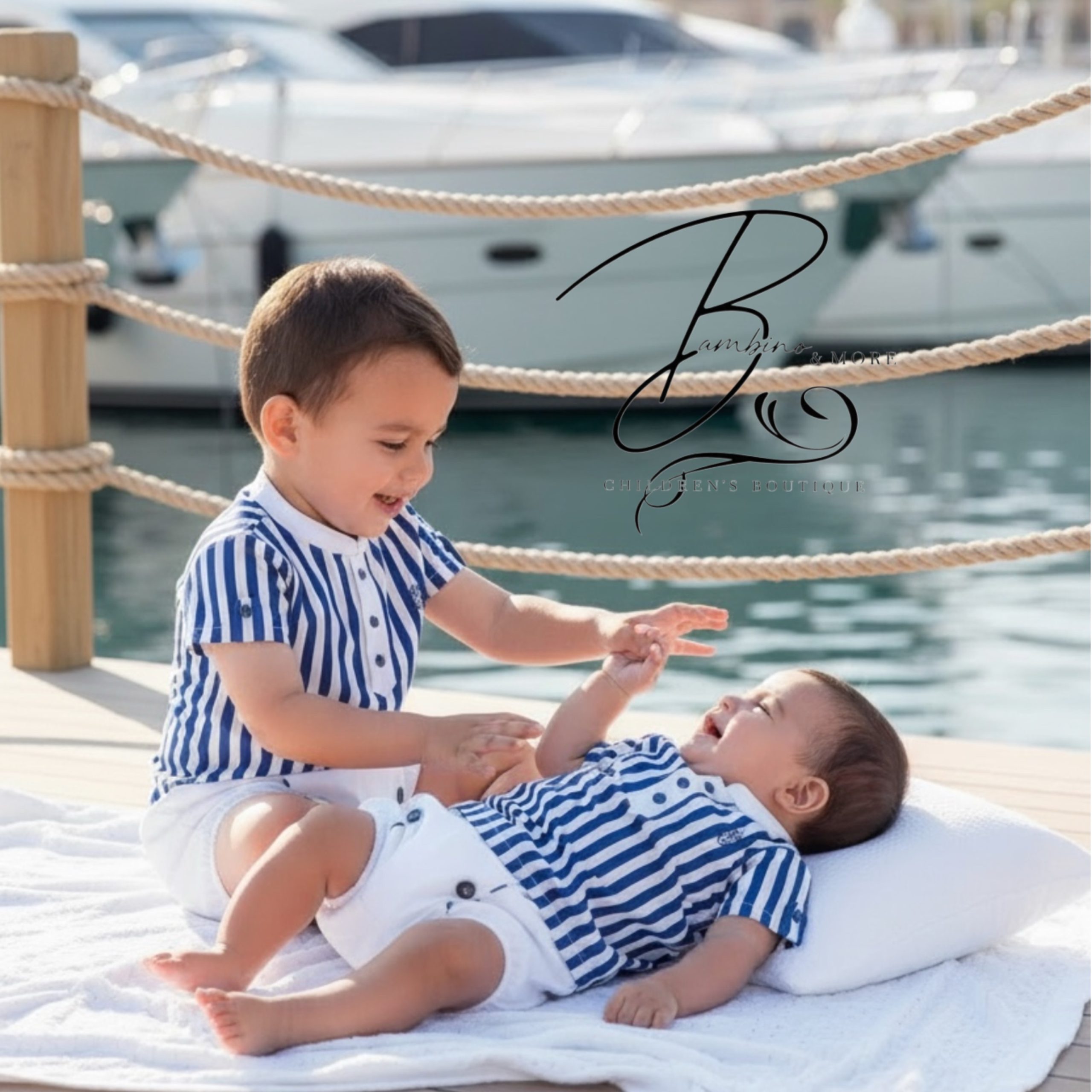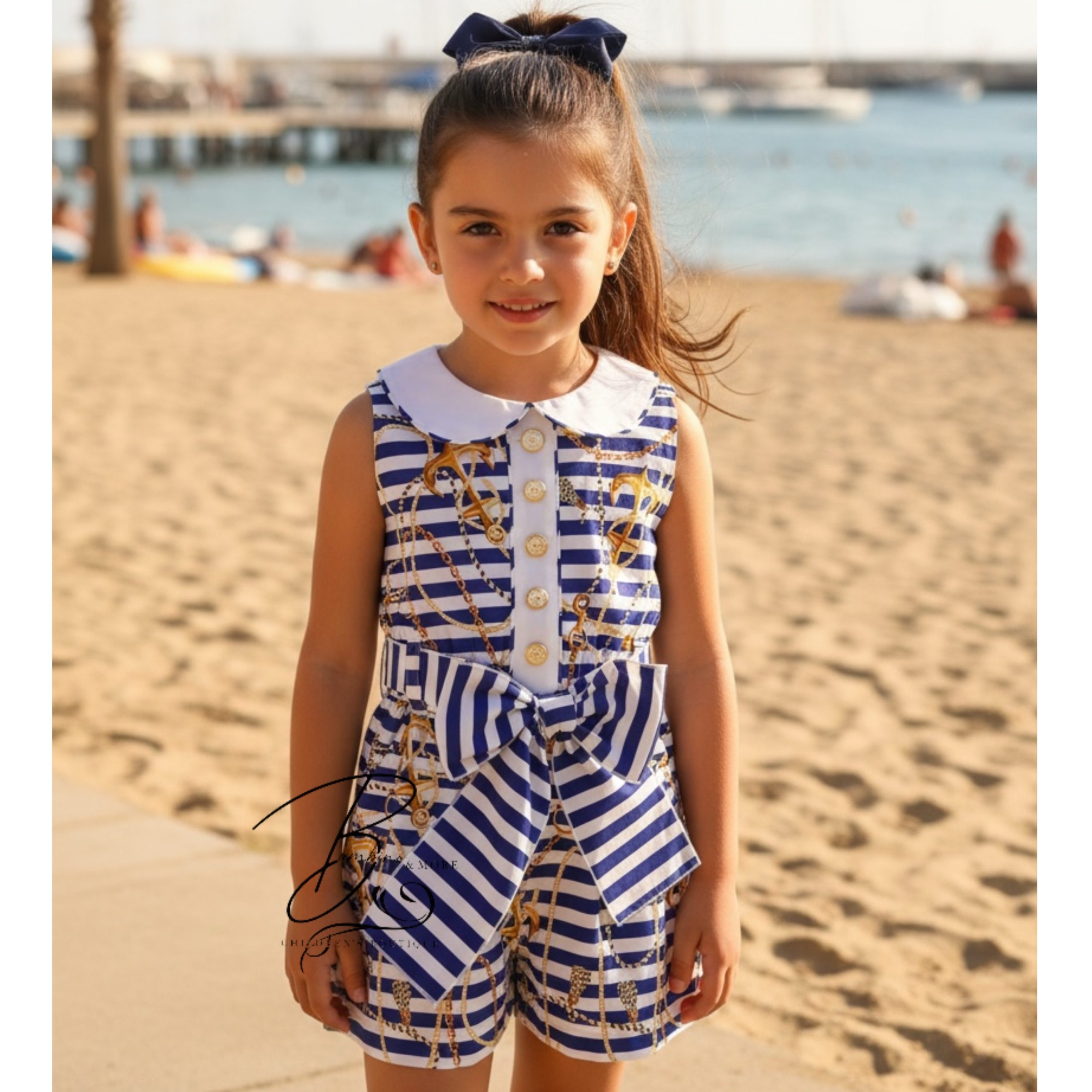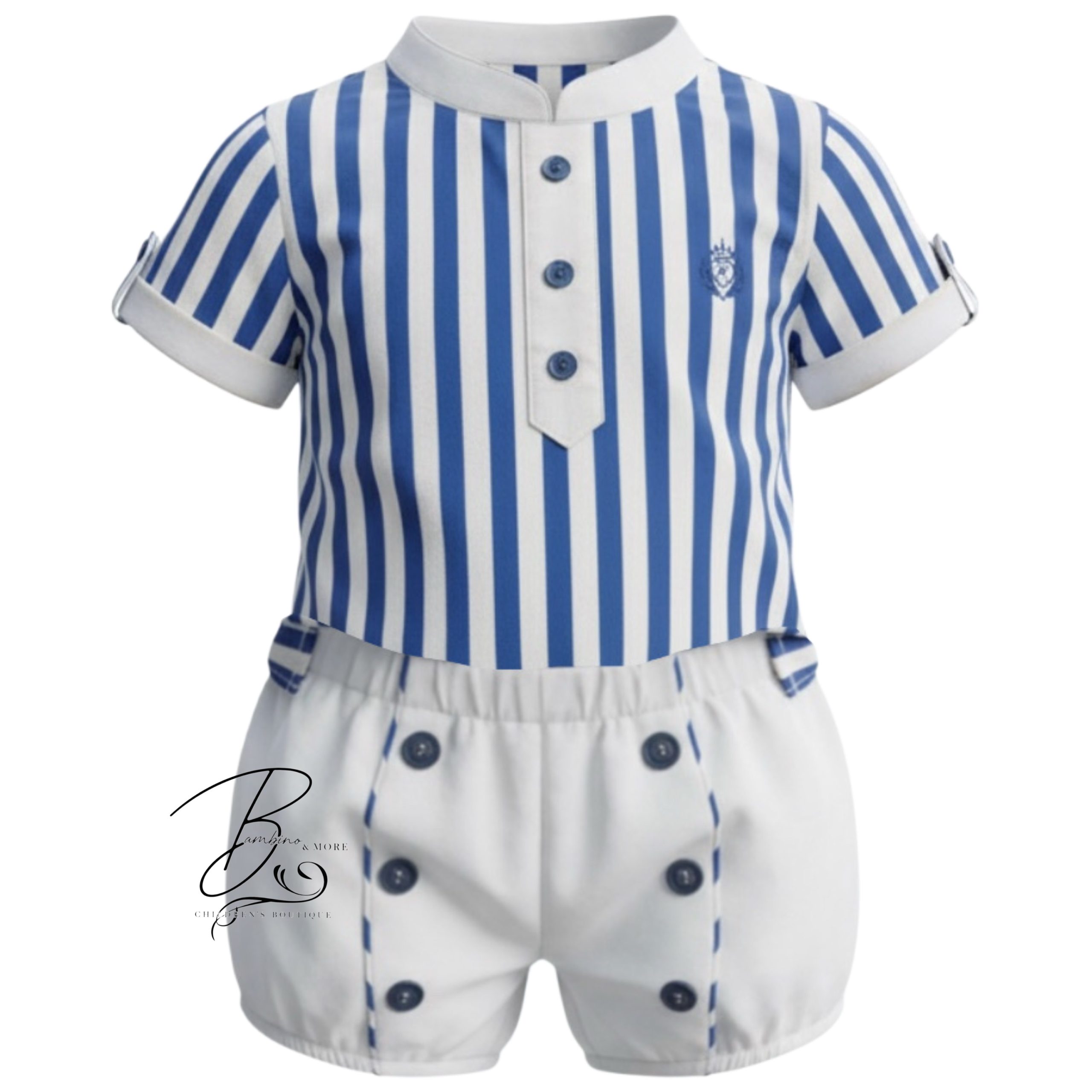Rochy boys navy blue and white striped romper set.