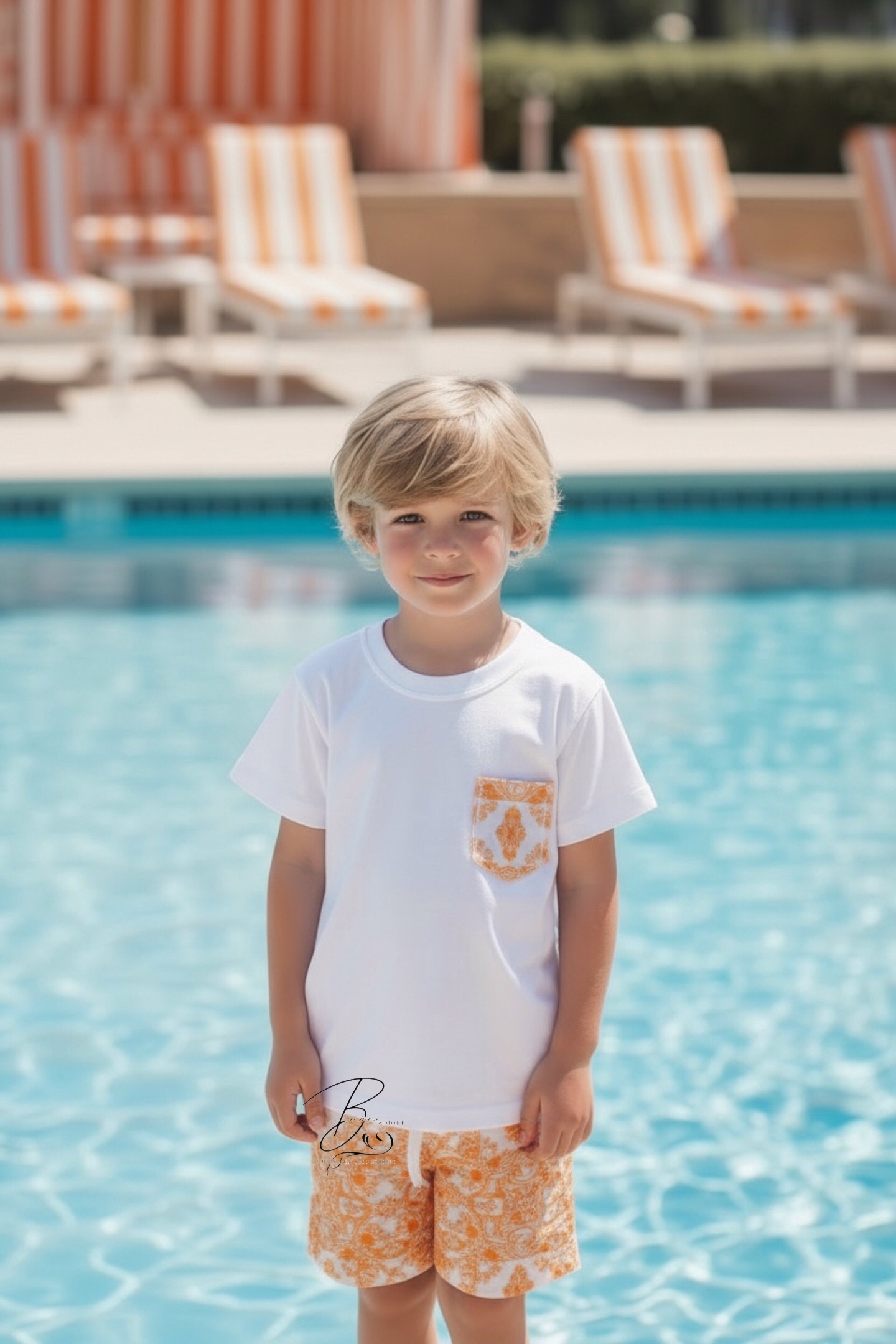 Get your little one summer-ready with the stylish Rochy boys orange swim short set, a perfect blend of comfort and classic design. This charming two-piece set includes a white short-sleeve T-shirt with a matching orange patterned chest pocket, paired with coordinating orange swim shorts.